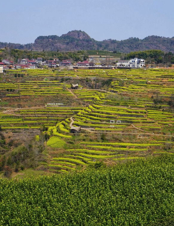 站在村口,你可以看见百亩梯田错落有致,油菜花交错生长。远山含黛,流水含情,风筝起,百花香。