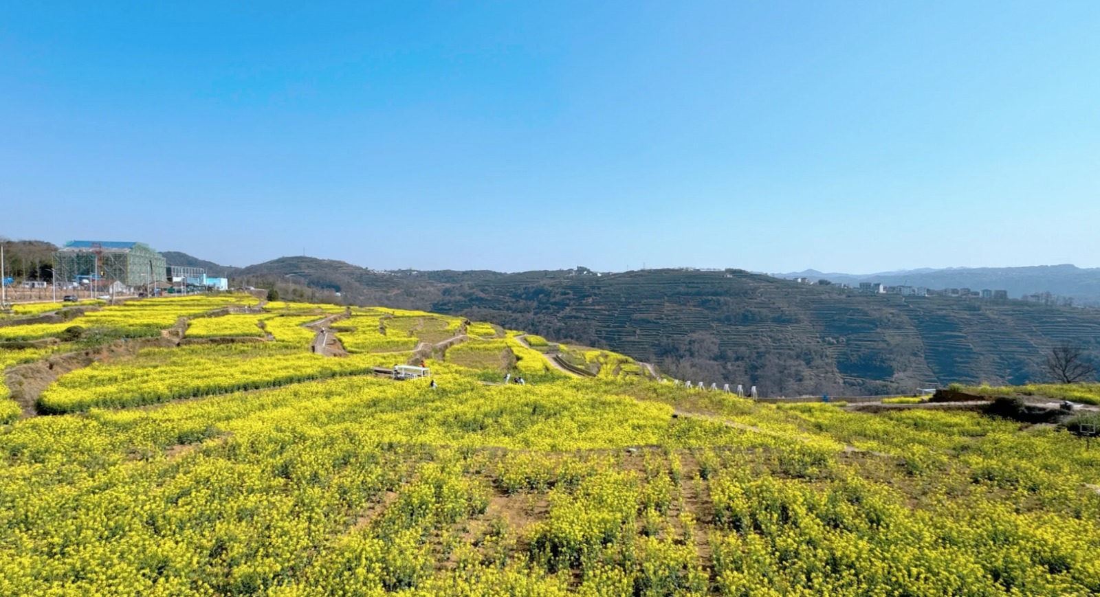 草长莺飞的春天,在东茗乡金山村的油菜花开成了海,满目金黄皆是春色。春风十里,整片花海都在起舞,犹如一幅金色画卷铺开在山水之间。