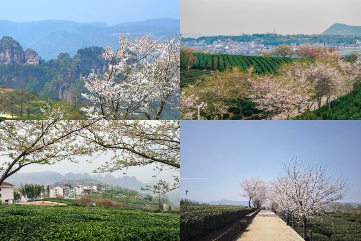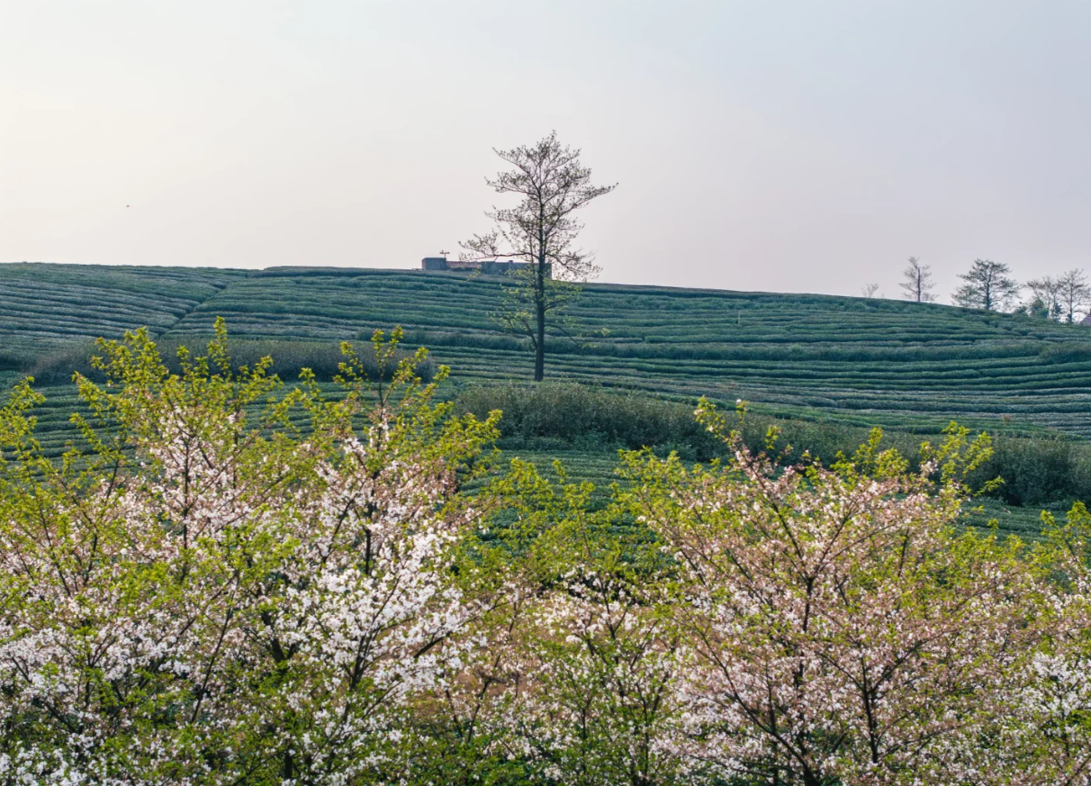 特别是那片点缀在青翠茶园中的樱花林,每当樱花绽放之时,纯白花瓣与碧绿茶丛相互映衬,形成一幅色彩鲜明的田园画卷。