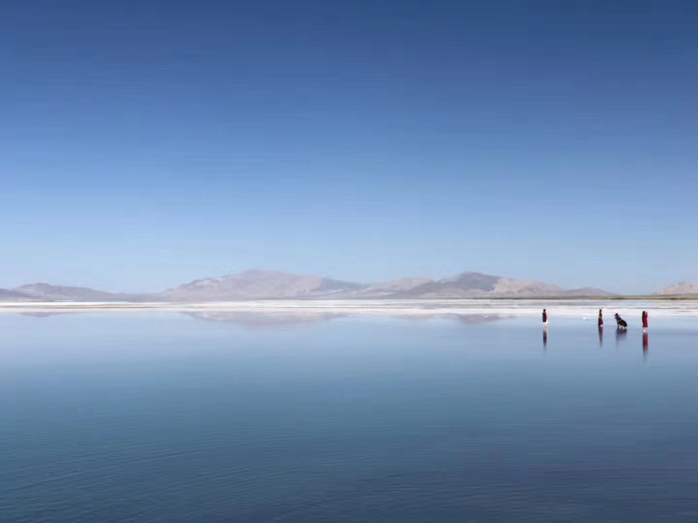 天气好时还可以看到远处的雪山,倒映在湖面。风平浪静时,湖面盐花似冰雪。