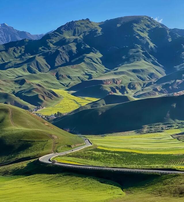 浓艳的黄花,紧沿着浩门河畔,横越门源盆地,在高原深蓝的天空下,与远山近水,村落人家相辉映,近看远观皆为美景。