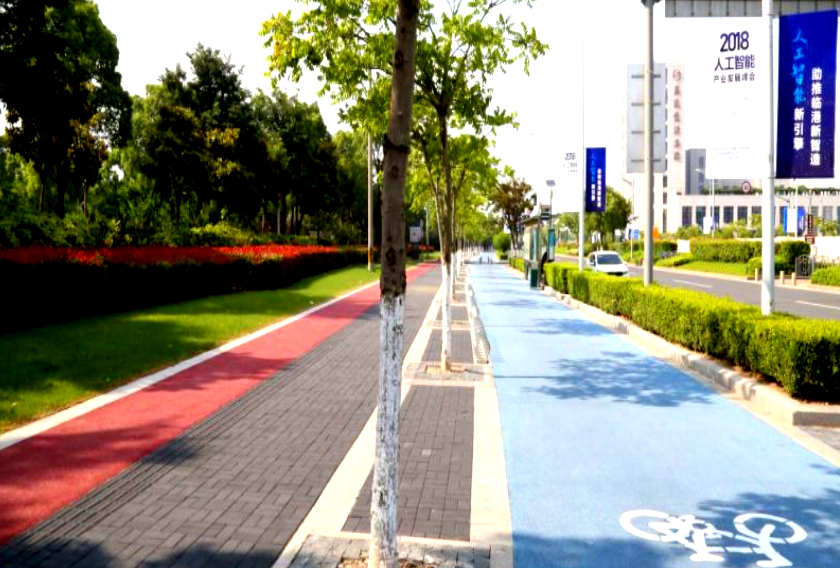 如今,临港大道、申港大道、沪城环路、环湖西三路、环湖西二路五条道路已经建成彩色非机动车道,骑行、跑步、慢走的居民们并行无碍,来往自如。