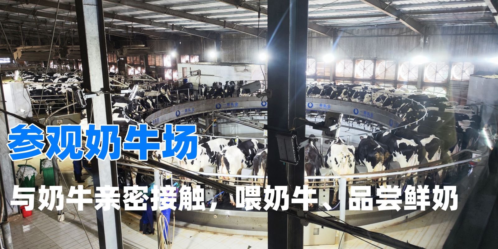 与牛舍相邻的挤奶区,牧场引进国际一流的50位转盘式自动挤奶装置,每天分三次挤奶,挤出的牛奶利用速冷系统及时冷却到2℃左右,输入至具有良好保温功能的室外奶罐临时保存,每天用专用鲜奶保温车拉至加工厂。