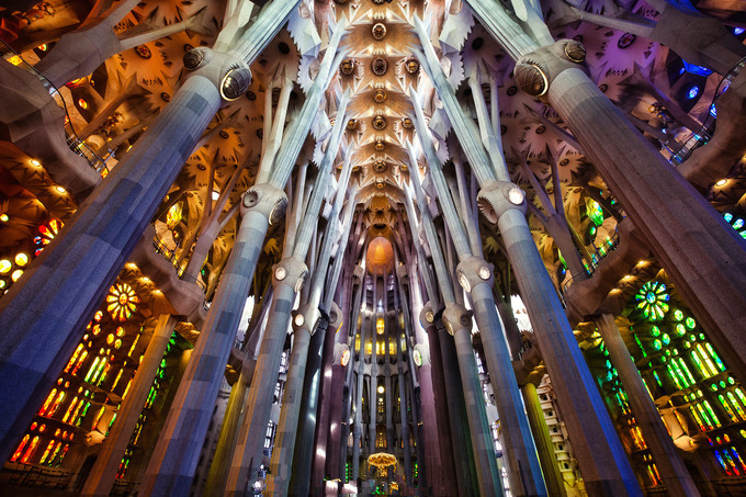这座倾注了高迪满腔虔诚的殿堂,无处不显示着这位旷世奇作的奇思妙想,对几何原理的娴熟运用、对自然元素的借鉴和对光线的妙用,令这座教堂显得超脱又独一无二。