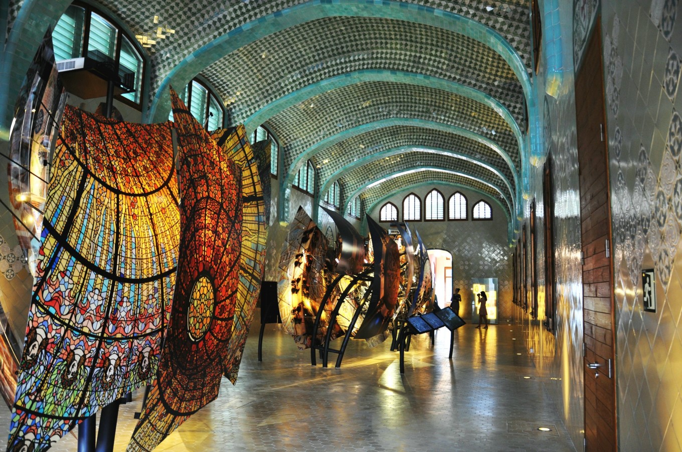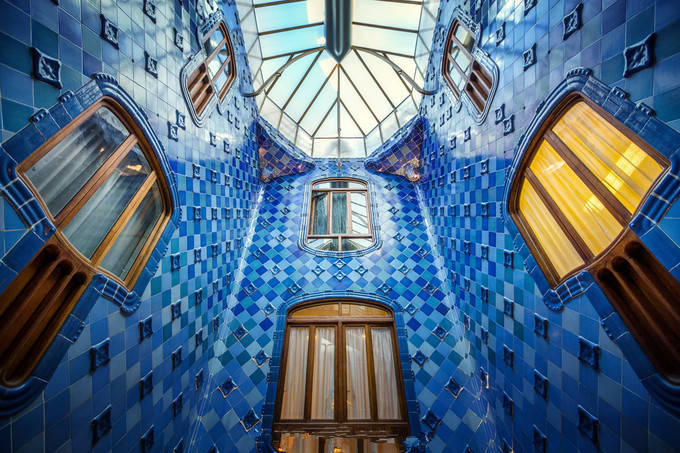 建筑内天井的设计灵感来源于深海,为了制造温和的光差,高迪用了15000块渐变色的蓝色瓷砖,越靠近建筑的顶层瓷砖的颜色越深。