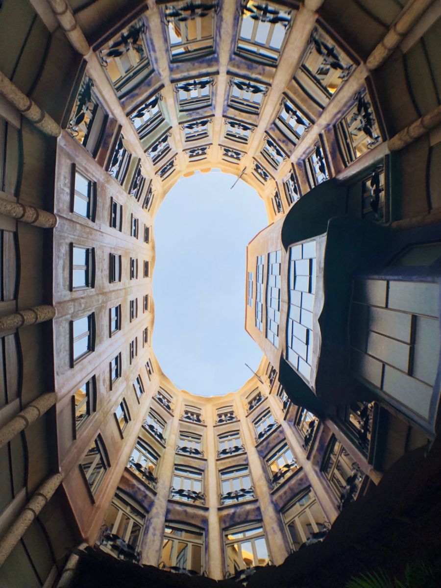 走进中庭抬头仰望,房子四面围合成环形,内嵌天井式的结构,让每一房间都能双面采光,柔和的光线下这些不规则的曲线构成的线与面,组成了高迪的幻想世界。