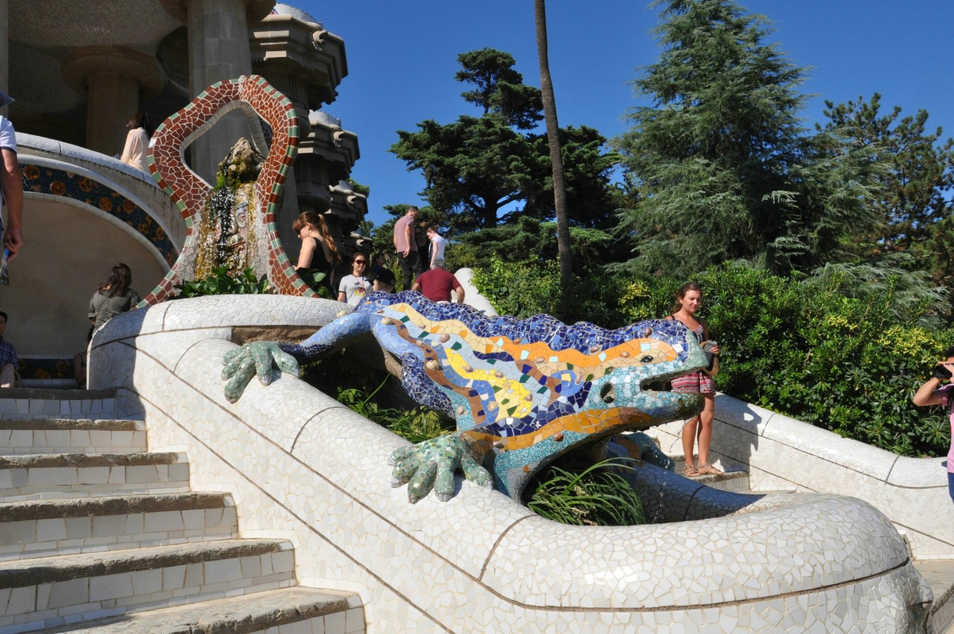 公园的入口处,有两座奇异的立体喷泉,一个是代表加泰罗尼亚的守护神—变色龙,另一个是加泰罗尼亚的徽章—巨型蜥蜴。二者表面均采用马赛克瓷片拼成,色泽艳丽,造型生动。除作为公园的主题象征和镇园之宝外,它们还兼具重要的排水功能。