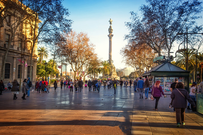 连接着加泰罗尼亚广场和地中海海湾的主干道兰布拉大道,是余秋雨笔下的流浪者大街,云集了世界各地的行为艺术家和游客。