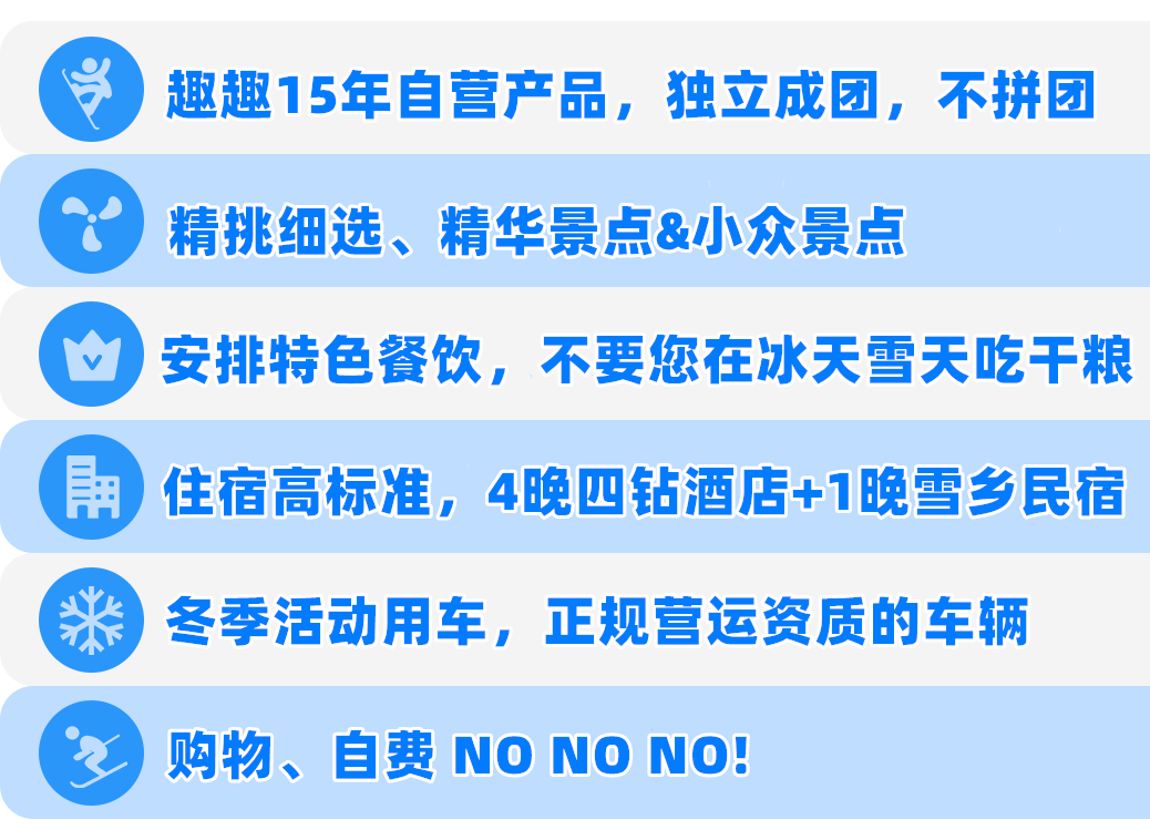 1、趣趣哈尔滨+雪乡行,分A线6天(哈尔滨-牡丹江-雪乡)和B线7天(哈尔滨-牡丹江-雪乡-延吉-长白山-吉林雾凇),大家根据自己的喜好来选择线。