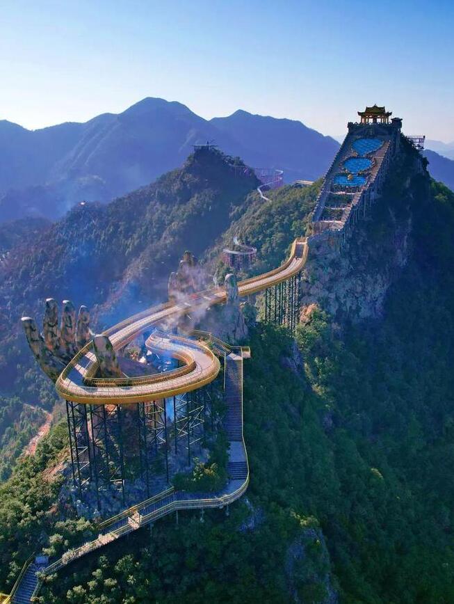在山顶上,还有一双巨大的佛手架着一座桥,这是景区的另一大亮点。这双佛手高耸入云,给人以崇敬和敬畏的感觉。