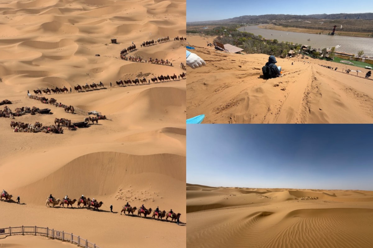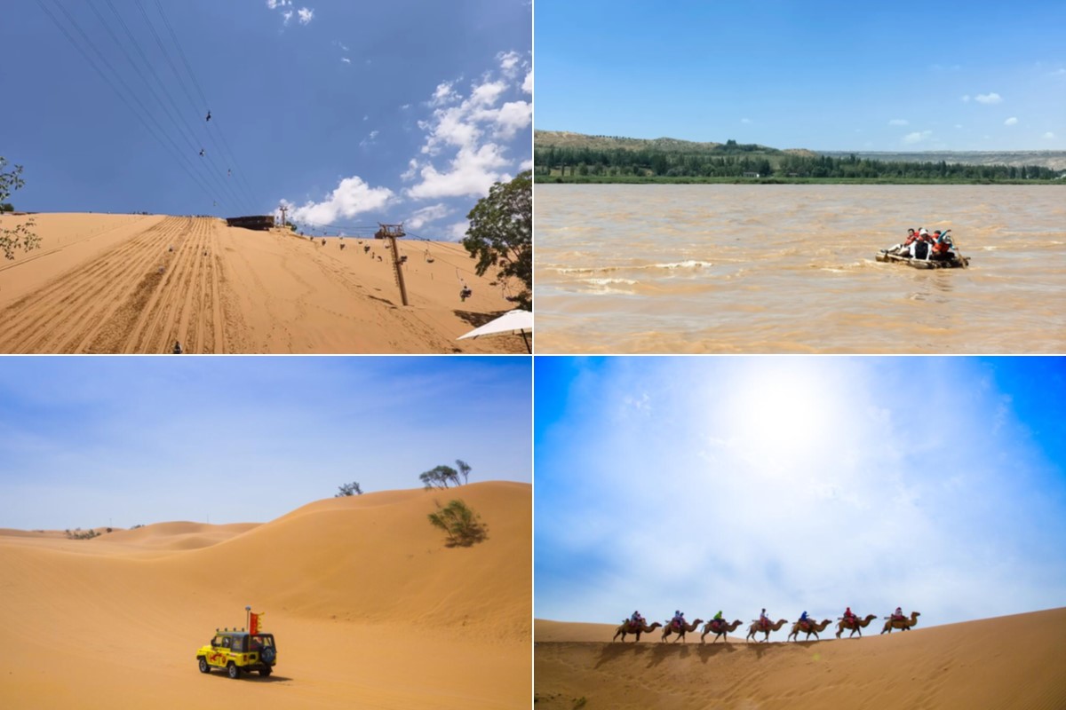 从中国最大滑沙场俯冲而下,坐上古法羊皮艇漂流黄河,乘坐沙漠天梯俯瞰沙与河的太极图,骑骆驼/越野车穿越沙丘时,风吹起纱巾的瞬间,氛围感拉满!