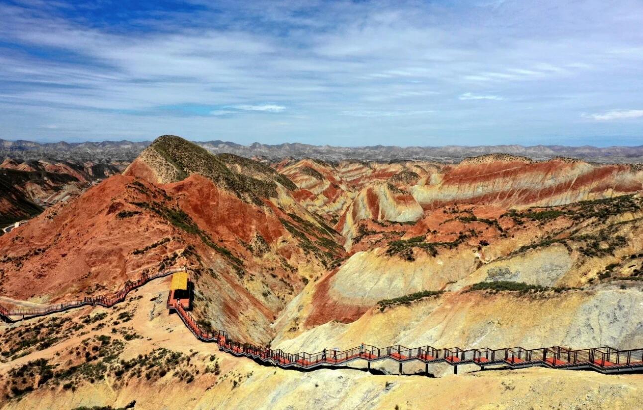站在观景台上俯瞰,绵延数十公里的丹霞群峰如浪涌般铺展,山脊线起伏跌宕,红岩与黄沙交织,远处的戈壁滩与蓝天相接,构成一幅极具张力的水墨长卷。