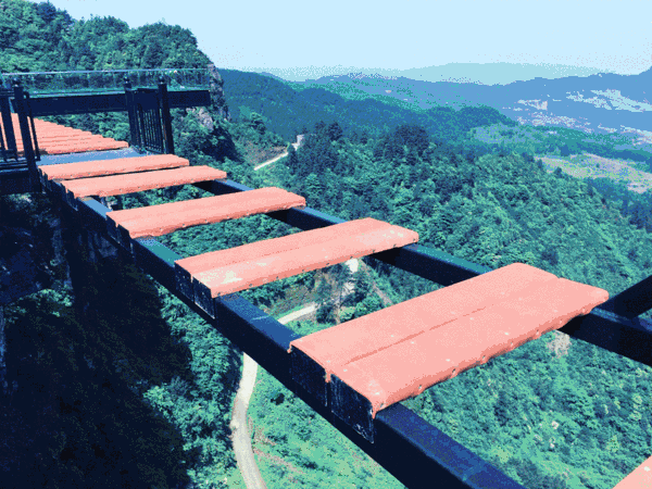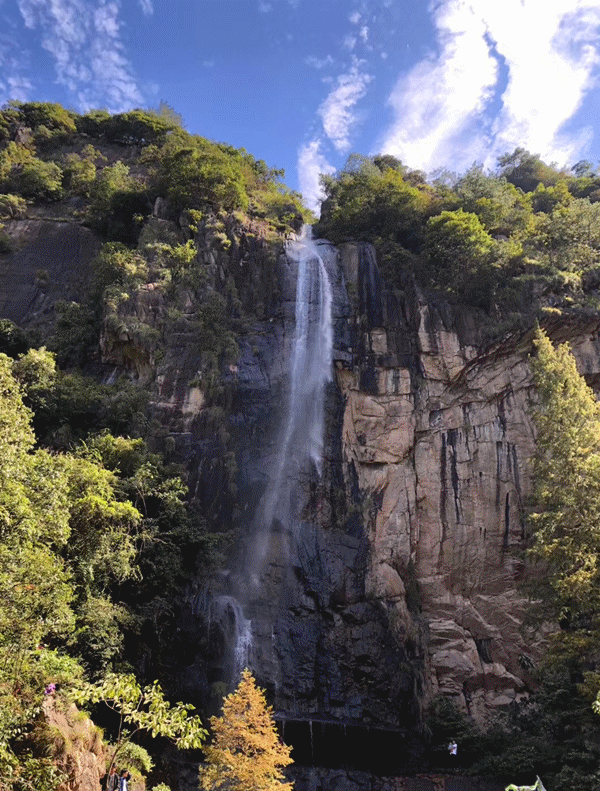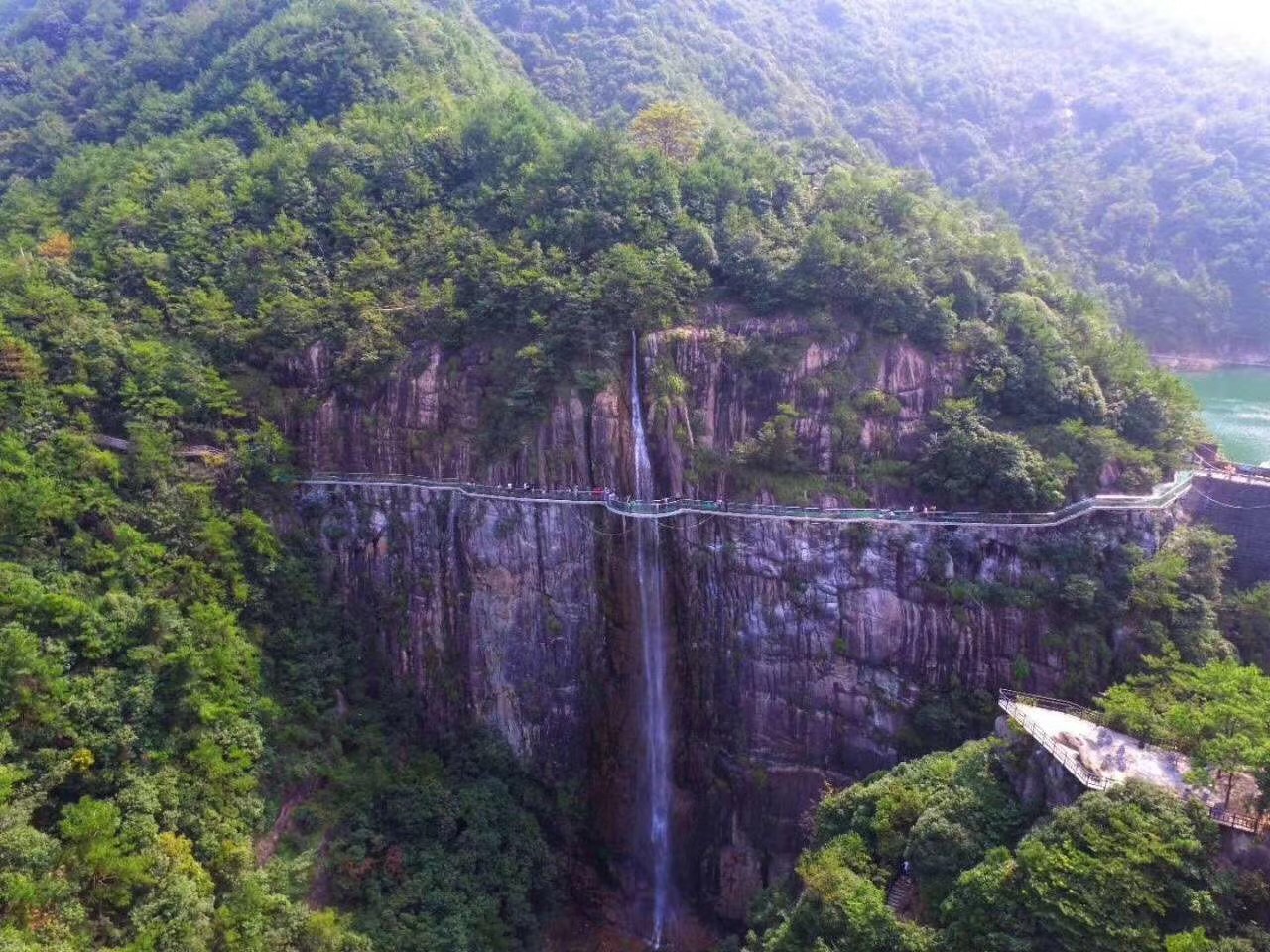 通天栈道倚瀑布旁崖壁盘曲而建,拾级而上,到达游龙戏风景点。