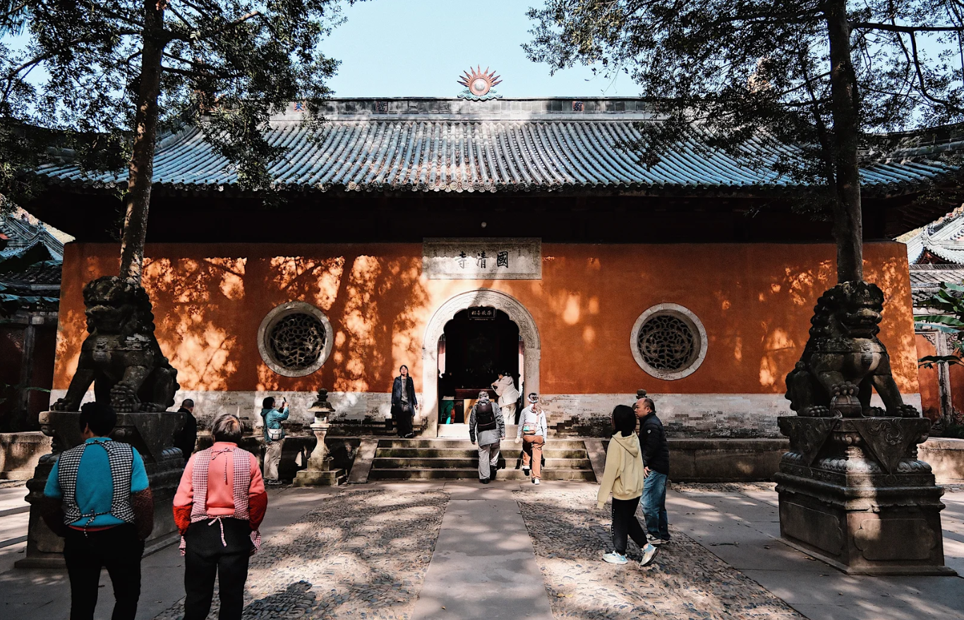 进寺便会被参天古树与潺潺溪流所折服,清幽、空灵、寂静、自在,寺院的山墙绵延在斑驳的光影里,一片一瓦、一草一木都向来者讲述着久远的故事。